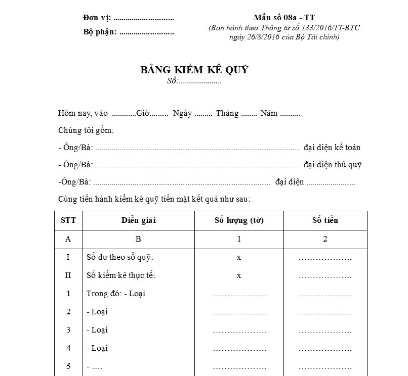 4.2. Mẫu biên bản kiểm kê quỹ tiền mặt theo Thông tư 133