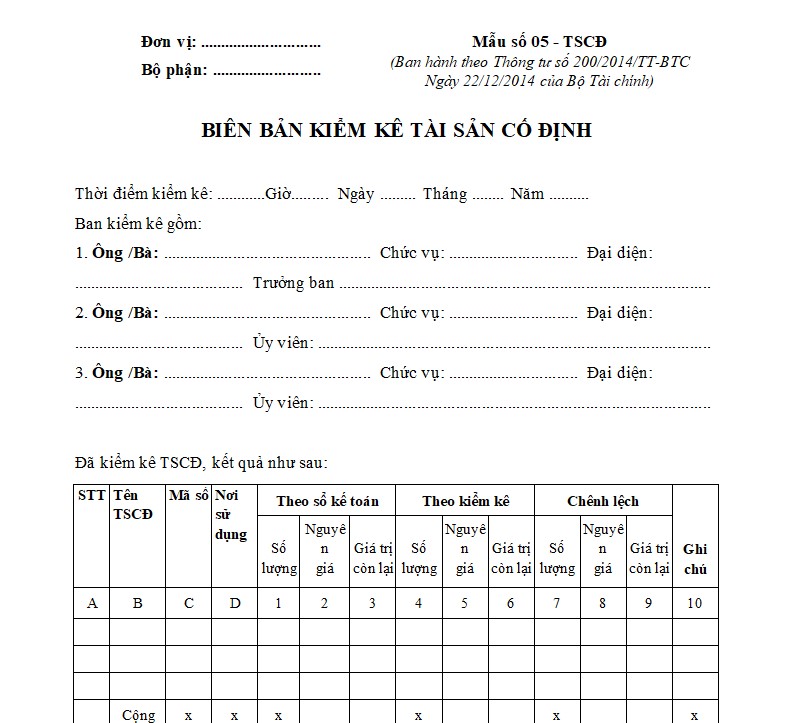 Mẫu biên bản kiểm kê tài sản cố định này được ban hành kèm theo Thông tư 200/2014/TT-BTC, áp dụng đối với các doanh nghiệp thuộc mọi lĩnh vực, mọi thành phần kinh tế. Mẫu biên bản này được sử dụng để ghi chép lại toàn bộ quá trình kiểm kê tài sản cố định của một đơn vị.