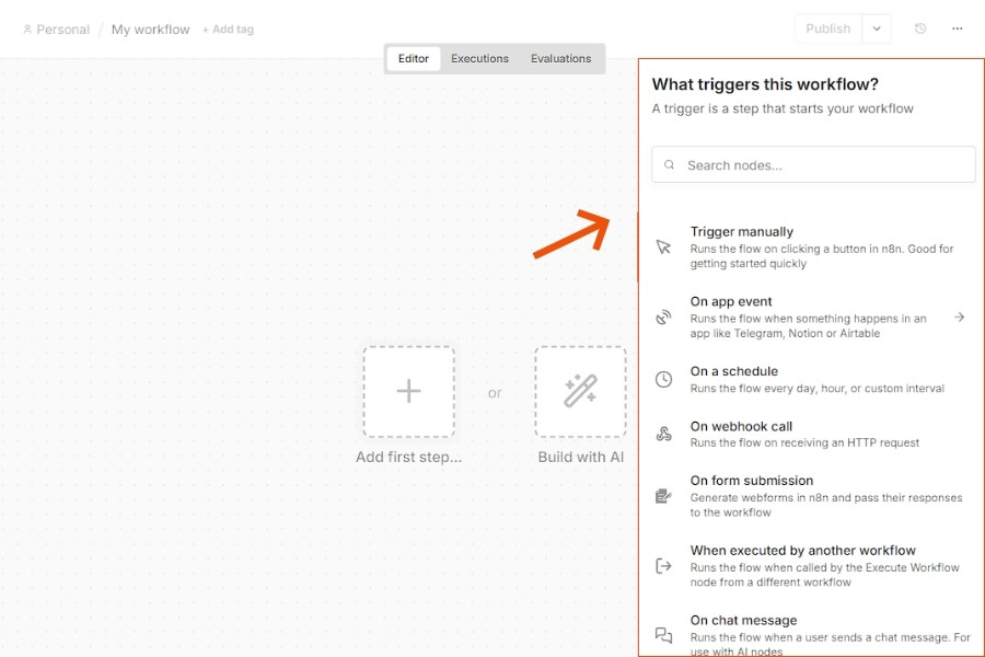 • Thêm “Trigger Node” bằng cách nhấn dấu (+) và lựa chọn ứng dụng phù hợp.