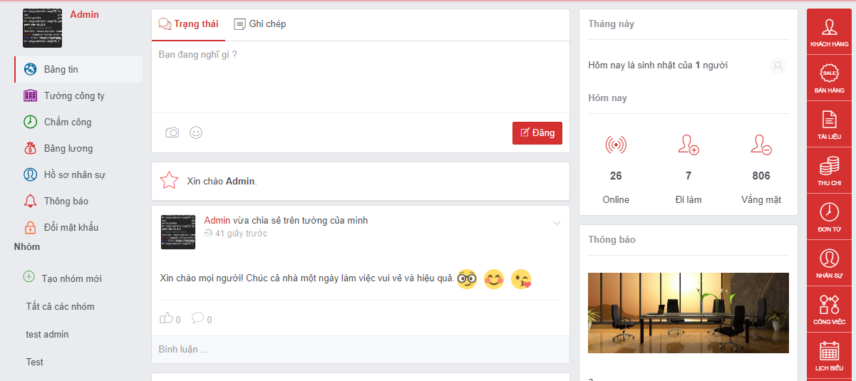 Bảng tin được coi là ngôi nhà chung – nơi mà Lãnh đạo, HR có thể đăng chính sách, thông tin quan trọng để truyền đạt cho toàn bộ nhân viên trong công ty. Thành viên trong công ty có thể tương tác, thảo luận ngay dưới bài đăng giống như một mạng xã hội thu nhỏ. Bảng tin giúp doanh nghiệp đẩy mạnh văn hóa thông tin nội bộ.