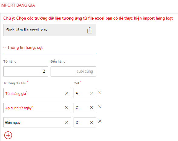Lưu ý: Trong danh sách Trường dữ liệu, những trường có chữ màu đỏ là trường bắt buộc phải import