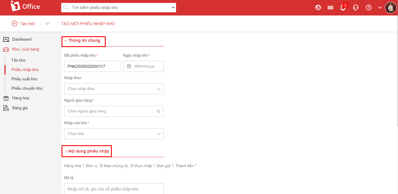 - Nhập vào các thông tin nhập kho cần quản lý tại màn hình tạo mới. Chọn các tab Thông tin chung, Nội dung phiếu nhập, Đối tượng liên quan để cập nhật thông tin tương ứng để cập nhật thông tin tương ứng