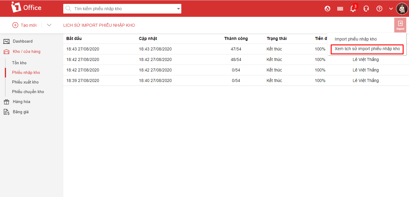 Chúng ta có thể kiểm tra lịch sử import từng lần bằng cách chọn biểu tượng import góc phải màn hình >> Xem lịch sử import phiếu xuất kho. Trên danh sách lịch sử import phiếu xuất kho chúng ta sẽ xem được số phiếu xuất kho import thành công từng lần là bao nhiêu, người thực hiện import, thời gian bắt đầu import,…
