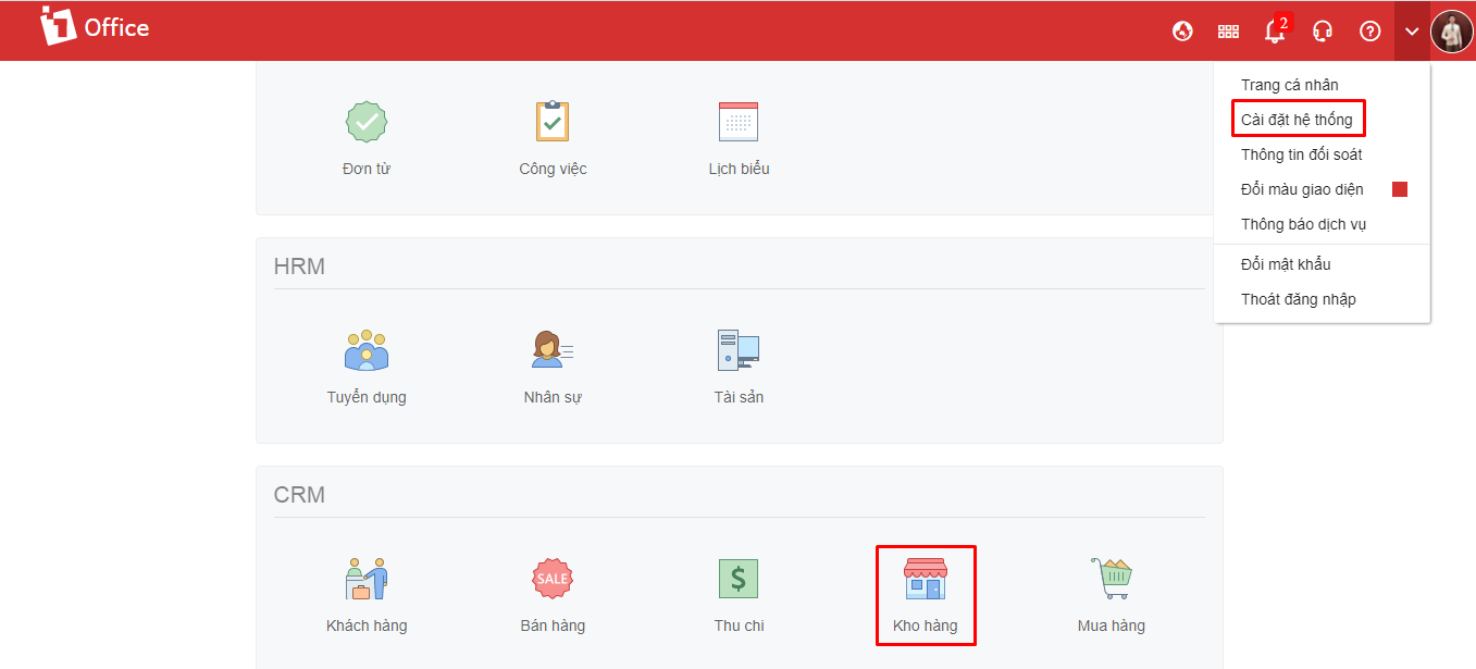 cạnh biểu tượng avatar (góc trên bên phải màn hình) >> Chọn Cài đặt hệ thống >> Chọn Kho hàng
