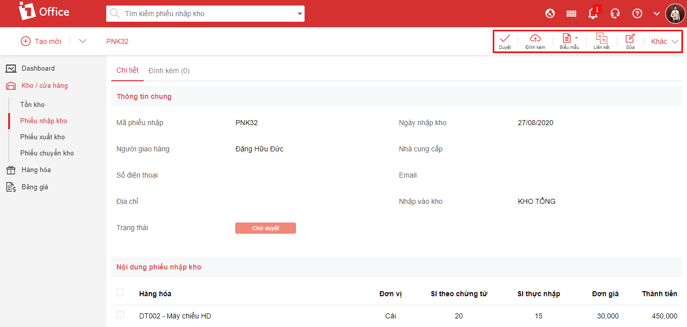 Các tính năng tại màn hình chi tiết phiếu nhập kho (góc trên bên phải màn hình)