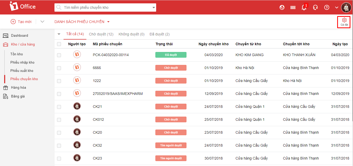 | 1 | Cài đặt | Người quản lý | Cho phép cài đặt quy trình duyệt phiếu chuyển kho |