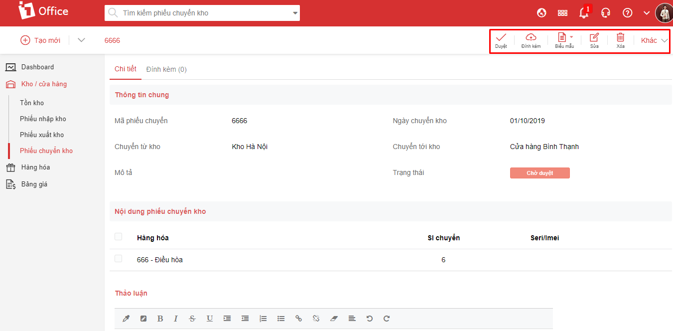 Các tính năng tại màn hình chi tiết phiếu chuyển kho (góc trên bên phải màn hình)