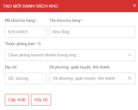 - Nhập vào các thông tin kho/cửa hàng cần quản lý tại màn hình tạo mới. Điền các thông tin cho kho/cửa hàng