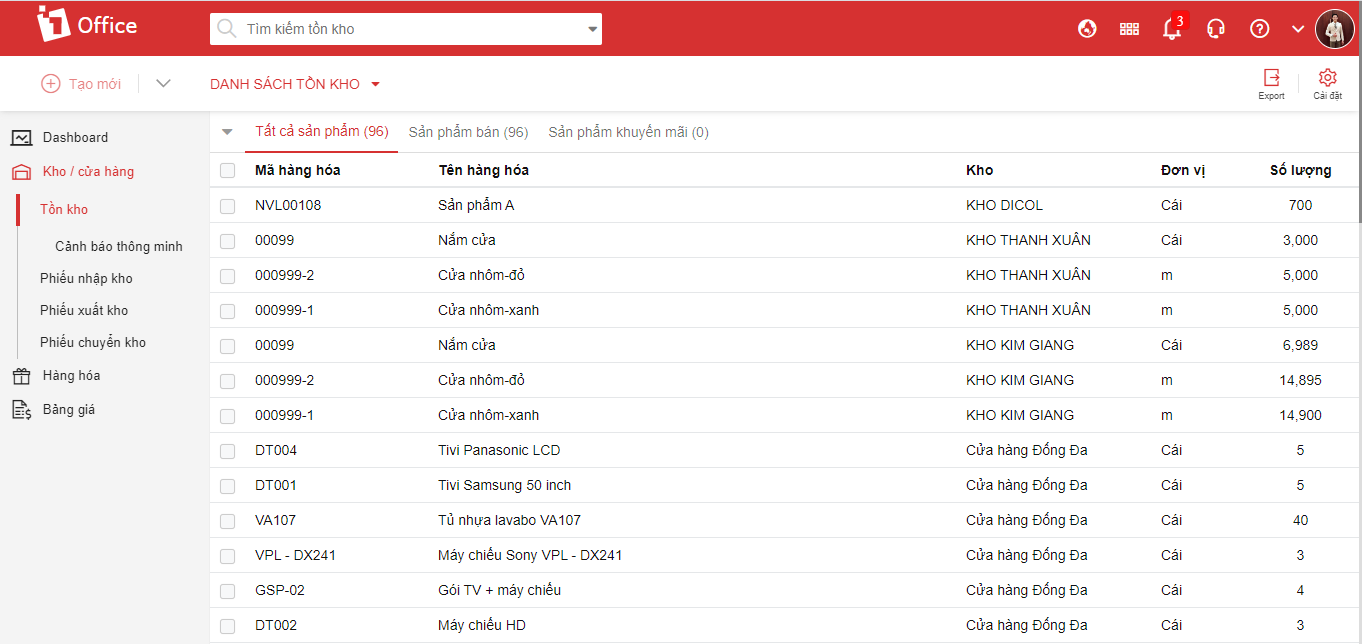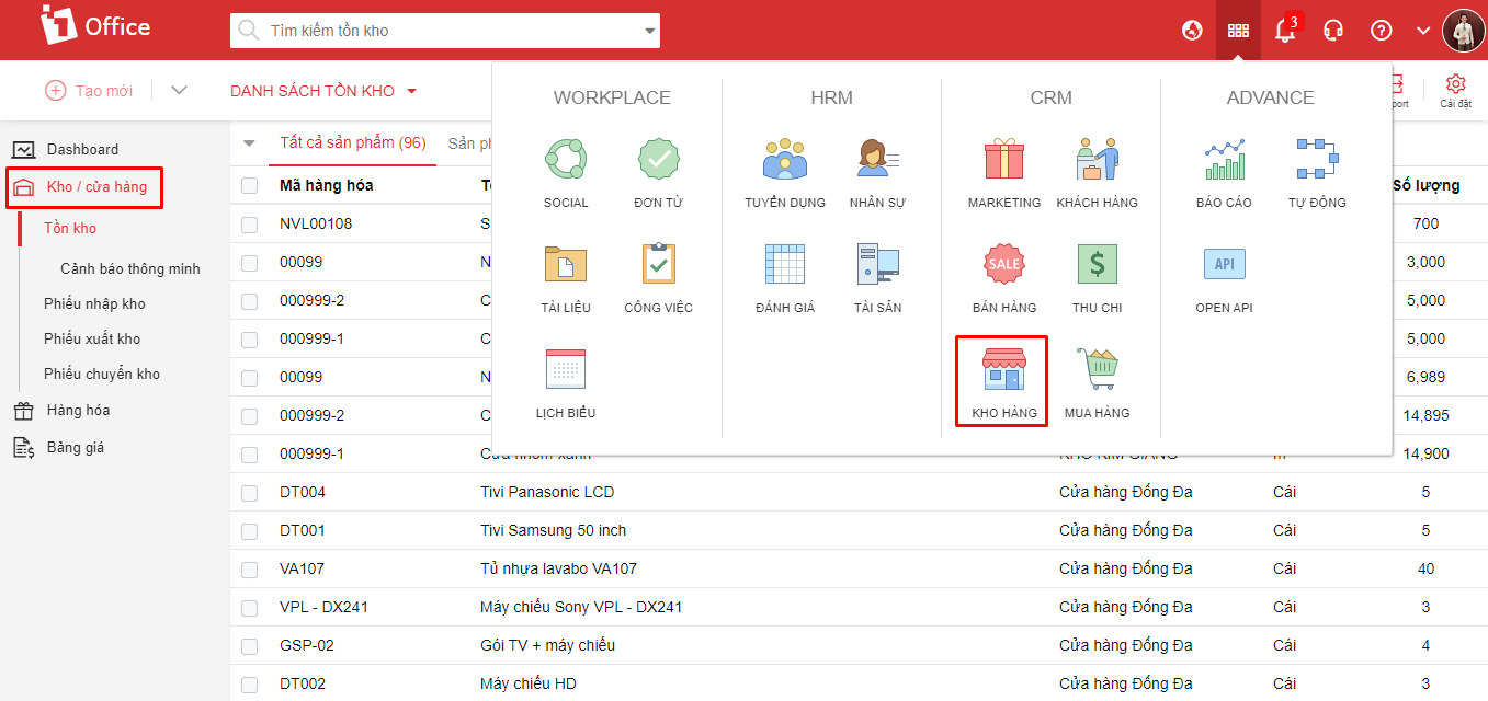 Kho/cửa hàng là nơi lưu trữ hàng hóa khi nhập về, quản lý các lần nhập xuất hàng theo Đơn hàng và Hợp đồng, cung cấp đầy đủ các tính năng để quản lý kho, cho phép tạo nhiều kho trên hệ thống. Tính năng Quản lý kho/cửa hàng, 1Office cho phép người dùng số hóa toàn bộ kho hàng cũng như các nghiệp vụ kho trên hệ thống, cụ thể như: