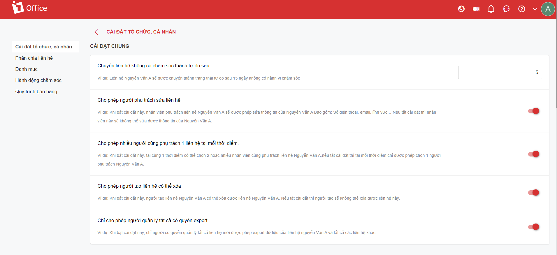 Ví dụ: Liên hệ Lê Quý Đức có người phụ trách là Phan Thị Tâm, nếu bật cài đặt này thì người phụ trách này có thể sửa lại thông tin của liên hệ đang phụ trách như số điện thoại, email,…