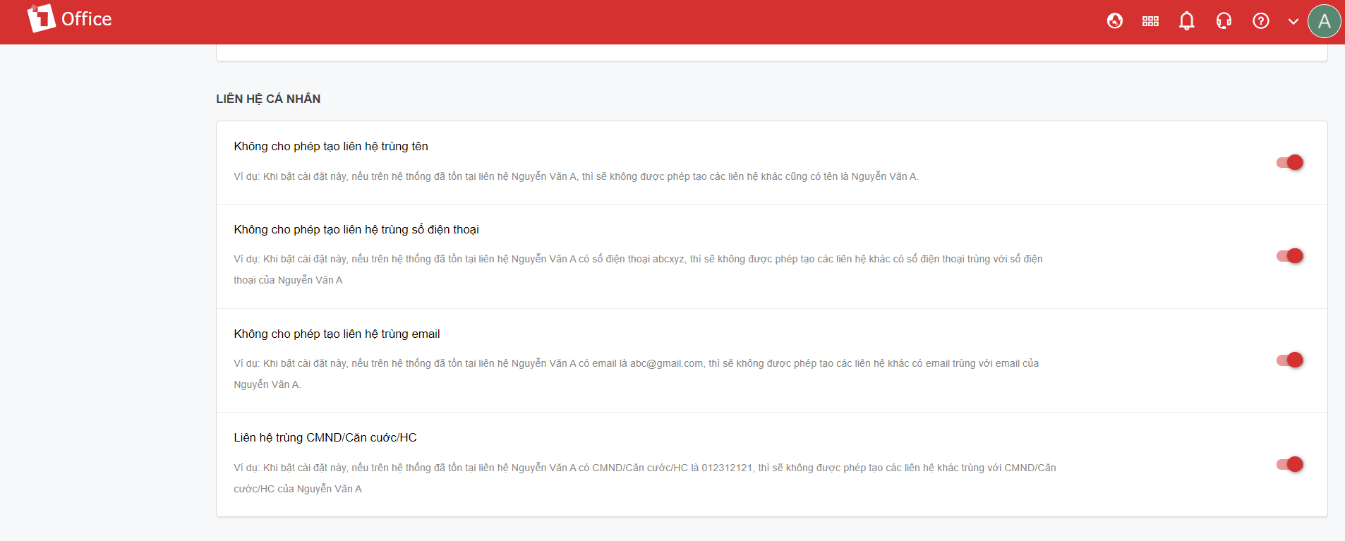 Ví dụ: Nếu bật cài đặt này và trên hệ thống tồn tại liên hệ cá nhân có số CMT 123456789 thì sẽ không thể tạo thêm được liên hệ cá nhân khác có cùng CMT 123456789