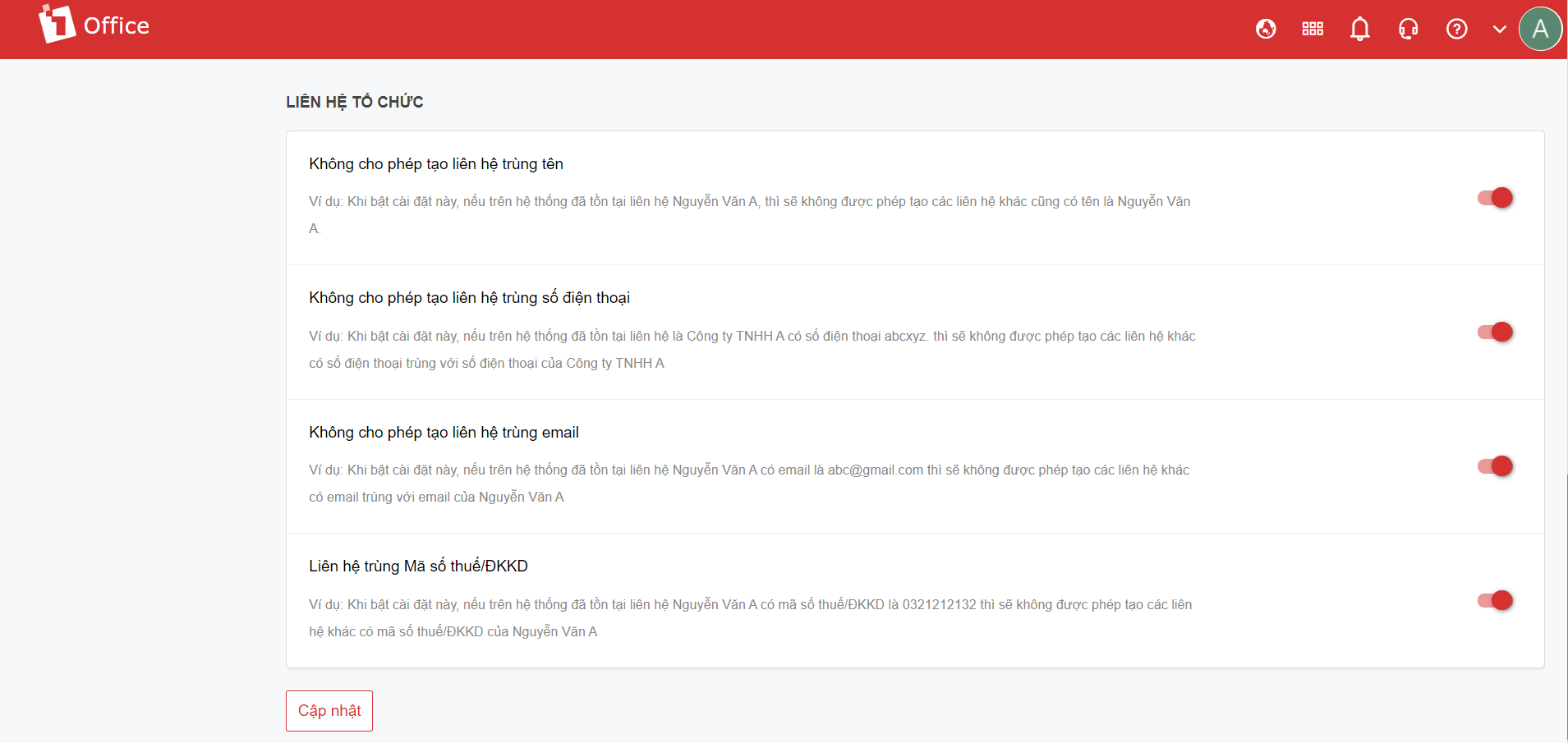 Ví dụ: Nếu bật cài đặt này và trên hệ thống tồn tại liên hệ tổ chức có số điện thoại 0123456789 thì sẽ không thể tạo thêm được liên hệ tổ chức khác có cùng số điện thoại 0123456789