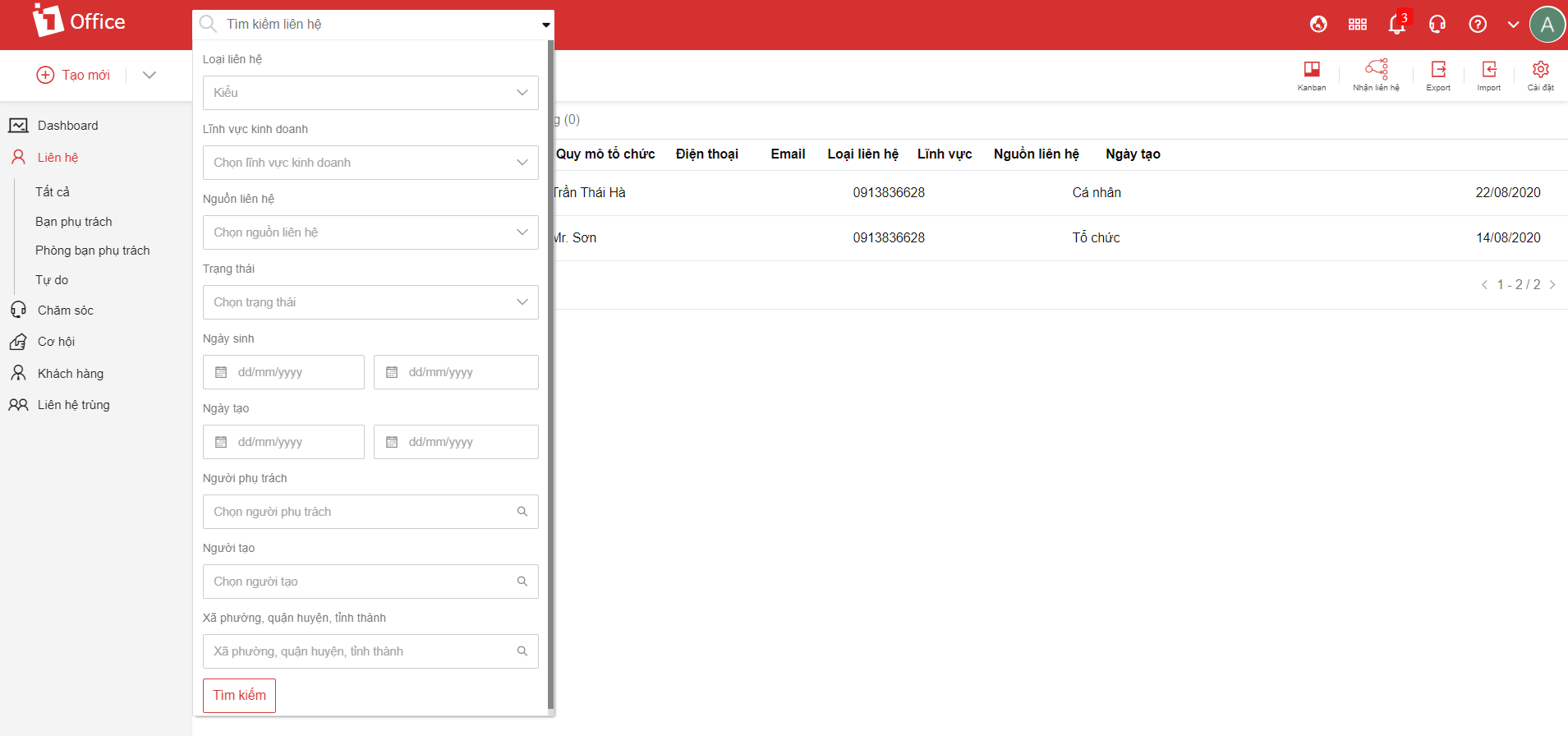 • Để tìm kiếm liên hệ có điều kiện người dùng có sử dụng bộ lọc nâng cao để tìm kiếm 1 cách dễ dàng và chính xác