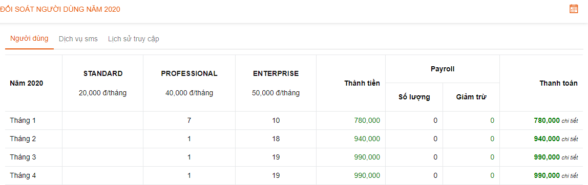 Ví dụ: doanh nghiệp có 30 người và sử dụng gói ENTERPRISE –> Chi phí cần trả của doanh nghiệp trong tháng sẽ : 30 * 60.000 = 1.800.000 VNĐ (phí sử dụng gói 60.000/tài khoản) . Giao diện đối soát sẽ được hiển thị như sau: