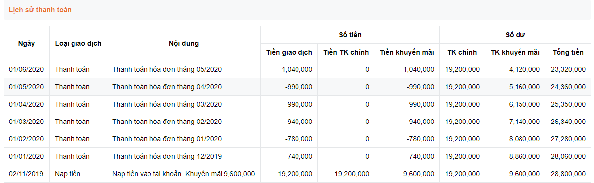 Màn hình Lịch sử thanh toán lưu trữ thông tin chi tiết các lần giao dịch, đó có thể là lịch sử nạp tiền hoặc thanh toán phí thuê bao hàng tháng, nội dung giao dịch, số tiền giao dịch và tổng số dư còn lại.