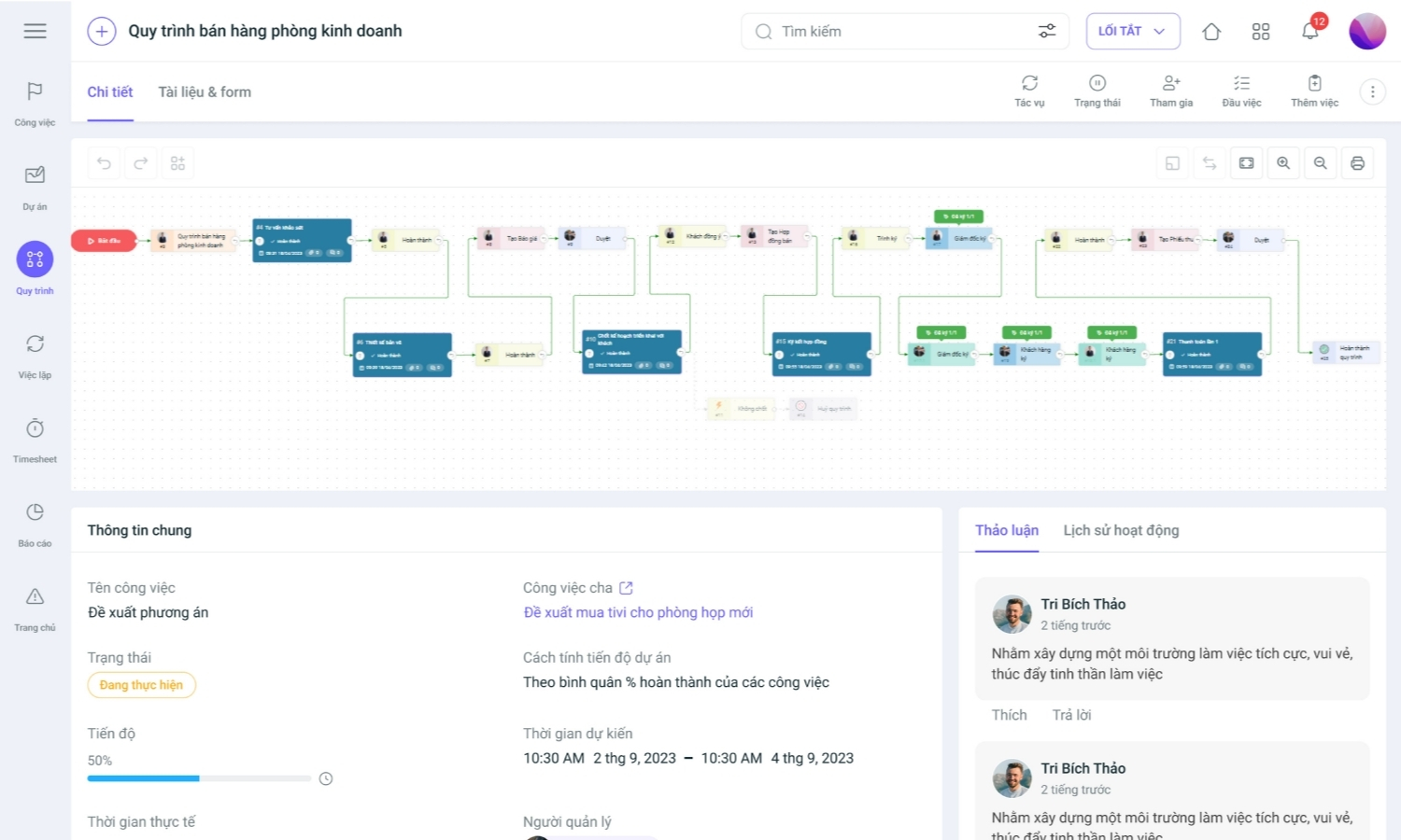 Giao diện workflow bán hàng 1Office với sơ đồ quy trình trực quan và chi tiết công việc