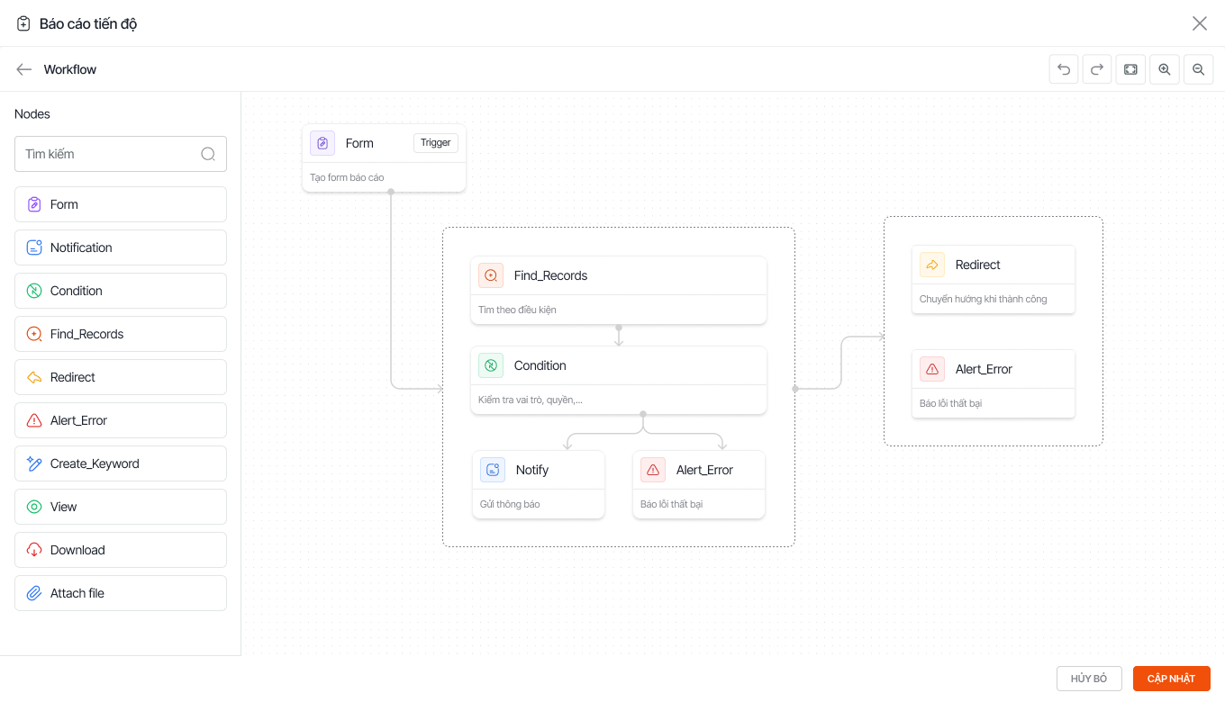 • Cấu hình hành động tự động: Định nghĩa các tác vụ hệ thống sẽ thực hiện ngay sau khi trigger xảy ra như gửi thông báo, cập nhật trạng thái nhiệm vụ hoặc luân chuyển hồ sơ.